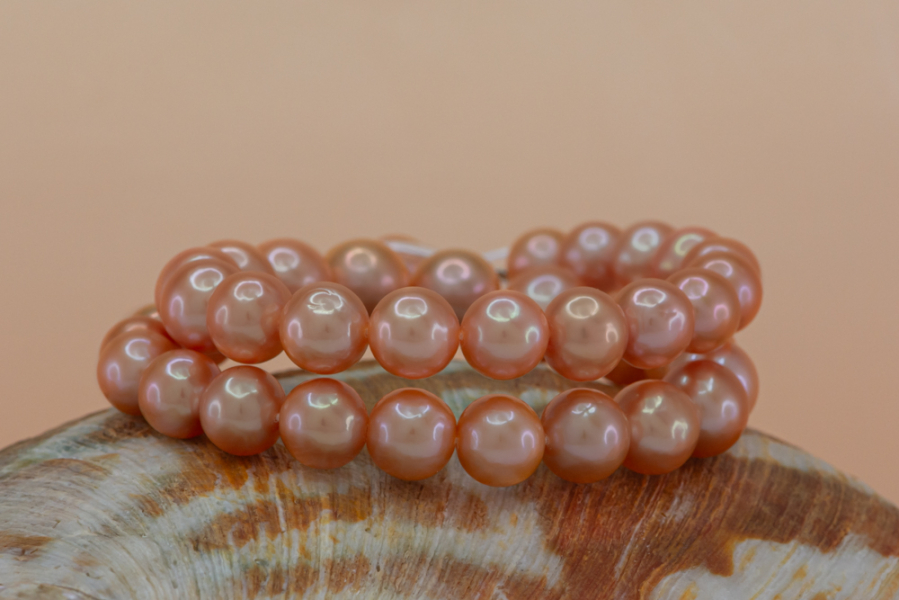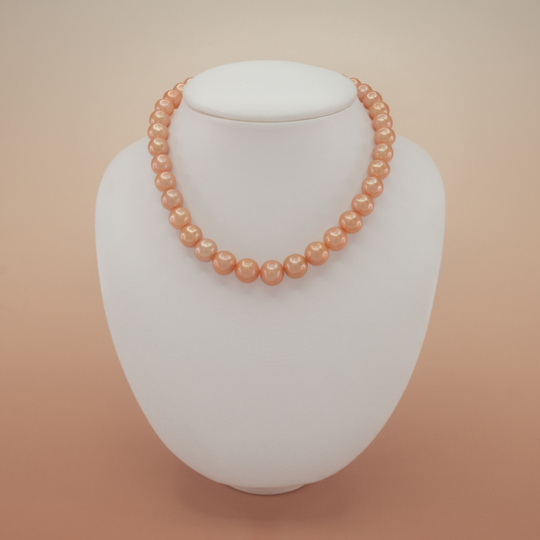 Při zářijové návštěvě veletrhu šperků v Hongkongu se nám podařilo opět zakoupit 3 exkluzivní perlové šňůry s úchvatným jedinečným lososovým odstínem perel, který se jen tak nevidí. Navíc ve velikosti 11 - 13 mm a kvalitě AAA. Podmanivá krása tohoto odstínu vás ohromí. Perly mají excelentní lesk, kulatý tvar a nádhernou vybarvenost. Náhrdelník jsme zakončili uzávěrem s pojistkou z bílého i žlutého 14kt zlata o váze 0,98 gr. Vaši volbu napište prosím do poznámky. K dokonalosti soupravy nesmí chybět 3 samostatné perly stejného odstínu velikostí 10,5 - 11,5 mm ke zhotovení visacích náušnic a přívěsku či prstenu. Perlová souprava s TOP perlami přírodního odstínu perel. Luxusní dárek, který vás vezme za srdce a v dekoltu ženy bude nepřehlédnutelný. Perlový náhrdelník jsme nafotili ještě před jejím navázáním uzlíkovou metodou, nyní máme zhotovený se zlatým uzávěrem skladem.