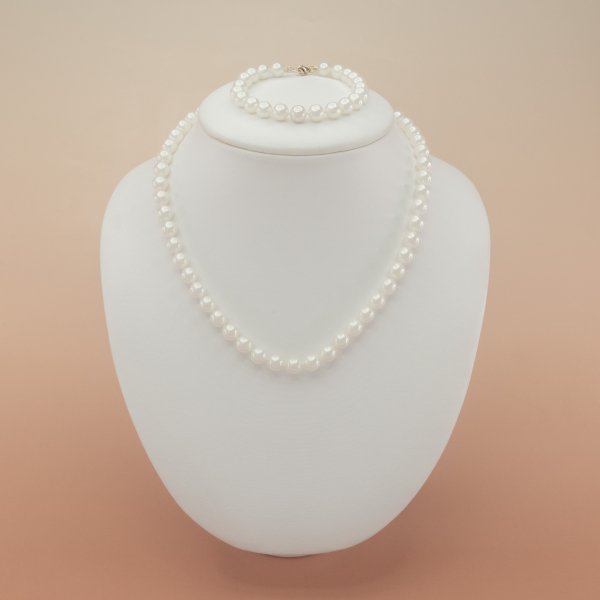 Perlová souprava z naší nové podzimní kolekce s překrásnými čistě bílými Akoya perlami o velikosti 7,5 - 8 mm. Perly mají excelentní lesk, kulatý tvar a vysokou sílu perleti. Náhrdelník a náramek jsme zakončili barokními karabinkami ze žlutého 14kt zlata. Perlovou soupravu jsme doplnili o jednoduché jemné náušničky s perlami stejného odstínu. Kvalitní puzetkové zapínání náušnic se zlatými komponenty o váze 0,68 gr je chráněno 2 drážkami, jejich ztráty se nemusíte obávat. Luxusní perlová souprava s japonskými perlami Akoya pro ženy každého věku. Perlová souprava za zvýhodněnou cenu.